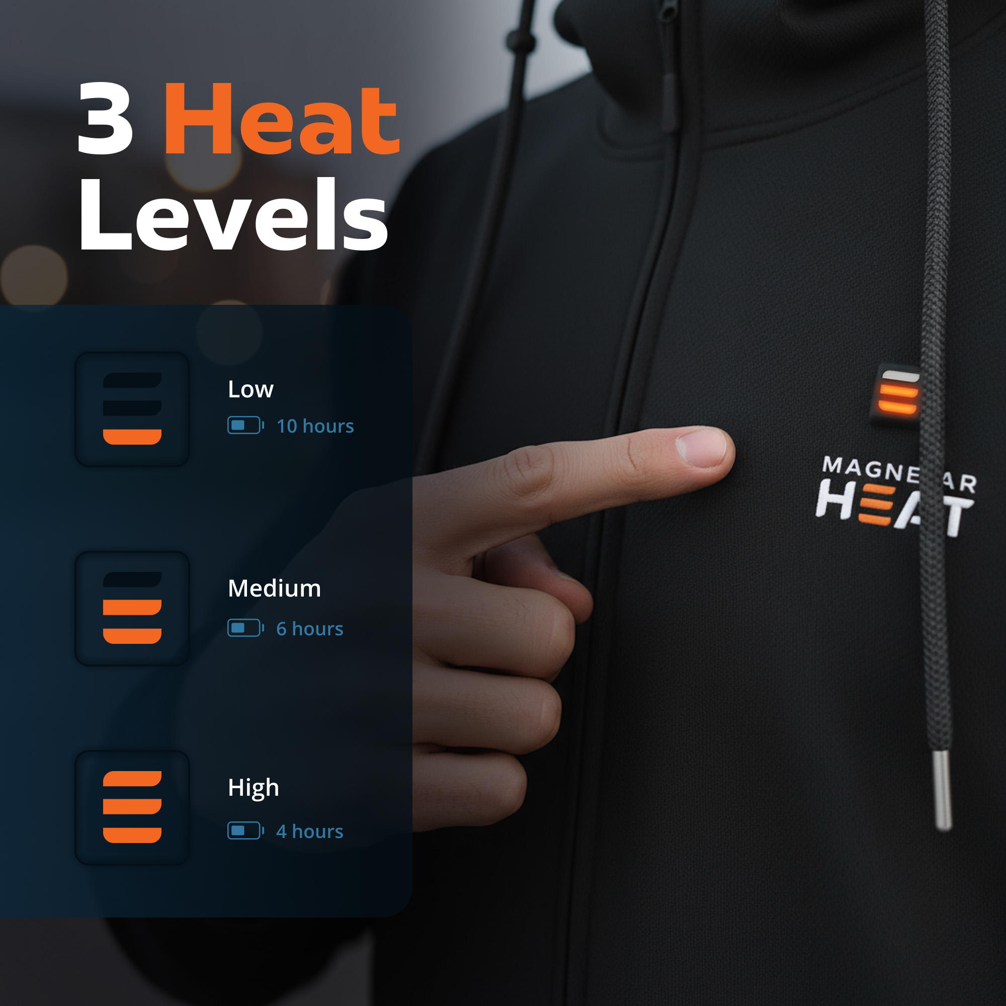 The heated hoodie from Magnetar Heat features discreetly hidden heating elements on the chest and back, providing targeted, even warmth to your body. With the included 13,000 mAh powerbank, you can enjoy up to 10 hours of heat, depending on the selected heat setting. The smart control button on the front allows you to easily switch between the three heat levels: